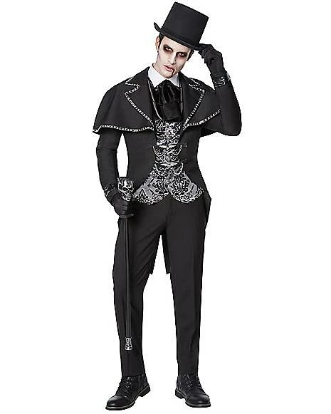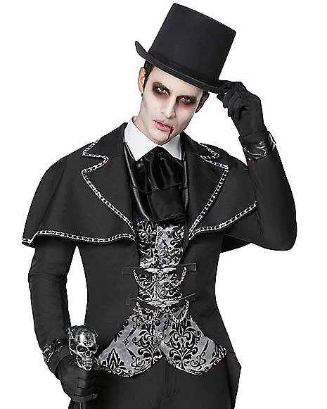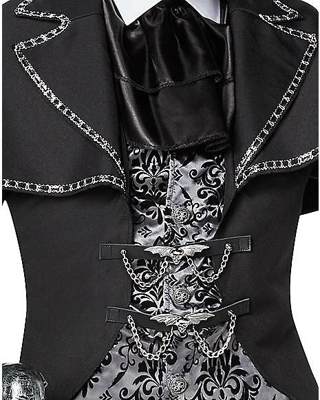 Embrace darkness in this midnight vampire costume! A long, black jacket features a dark shoulder cape and an attached damask-print vest. A ruffled neck tie adds a formal touch to this ornate ensemble. Bring this nightmarish look to completion with a skull-topped cane!