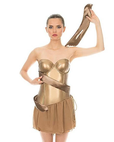 Get ready to save the world when you slip into this adorably sexy Wonder Woman dress. The gold-coloring will have you looking like royalty this Halloween. Cross body straps give you an asymmetrical look that is sure to have you standing out in the crowd. We hope you’re ready to be crowned for best costume!