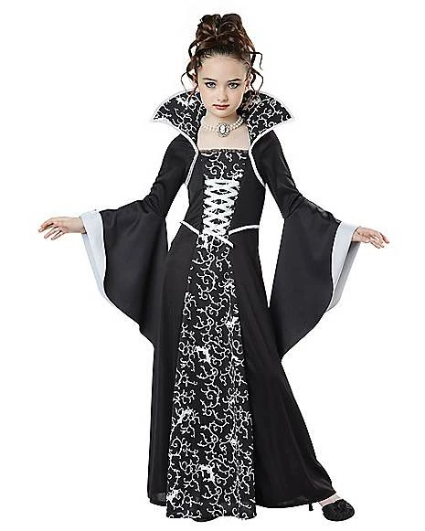 Candy isn’t the only thing you’ll be biting into this Halloween. This Midnight Vampire Girls Costume will transform you with its long, black dress featuring white lace-up details. The dress also has elegant bell sleeves and a high structured collar that matches the middle panel of the dress. Add on the included choker and a set of pointed teeth (sold separately) and you’ll be ready to rise from your coffin and trick-or-treat this year!